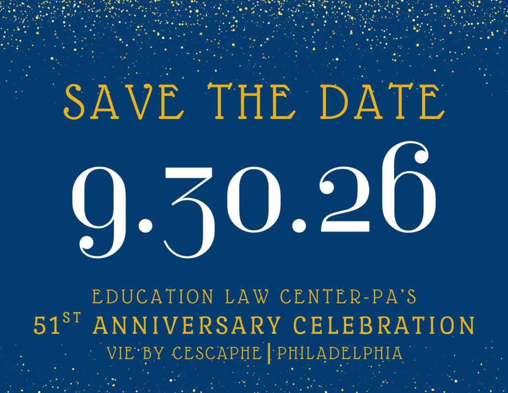Mark your calendars today! We invite you to join us on Sept. 30, 2026, for the Education Law Center’s 51st anniversary celebration at Vie by Cescaphe in Philadelphia.